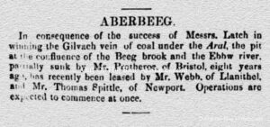 On Saturday the 19th of November 1859, the Star of Gwent newspaper reported that the Aberbeeg Colliery had been partially sunk eight years previous prior to it being taken over or leased by Messrs Webb and Mr Thomas Spittle. The report (as seen left) states as follows – In consequence of the success of Messrs Latch in winning the Gilvach vein of coal under the Aral (Arael Mountain), the pit at the confluence of the Beeg brook and the Ebbw river, partially sunk by Mr Protheroe, of Bristol, eight years ago, has been recently been leased by Mr Webb of Llanhilleth and Mr Thomas Spittle of Newport. It went on to say, operations are expected to commence at once.