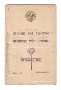 November 1926 preparations were put in force for the unveiling and souvenir programmes were printed and sold at 3d. each. The surveyor had reported to the council that children had damaged the memorial site and requested that the education authority to ask the head teachers to lecture the children on the sacredness of the memorial and to appeal to ministers of religion to refer to the matter from their pulpits. Owing to the damage being caused to the memorial and theft of materials from the site a night-watchman was employed by the council.
