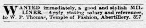 While at Abertillery Mr William Price Thomas and his wife Ellen were proprietors of the Temple of Fashion, Market Street, Abertillery (as seen in the advertisement from 1882). As stated this may have been the original Glasgow House or a part of it.